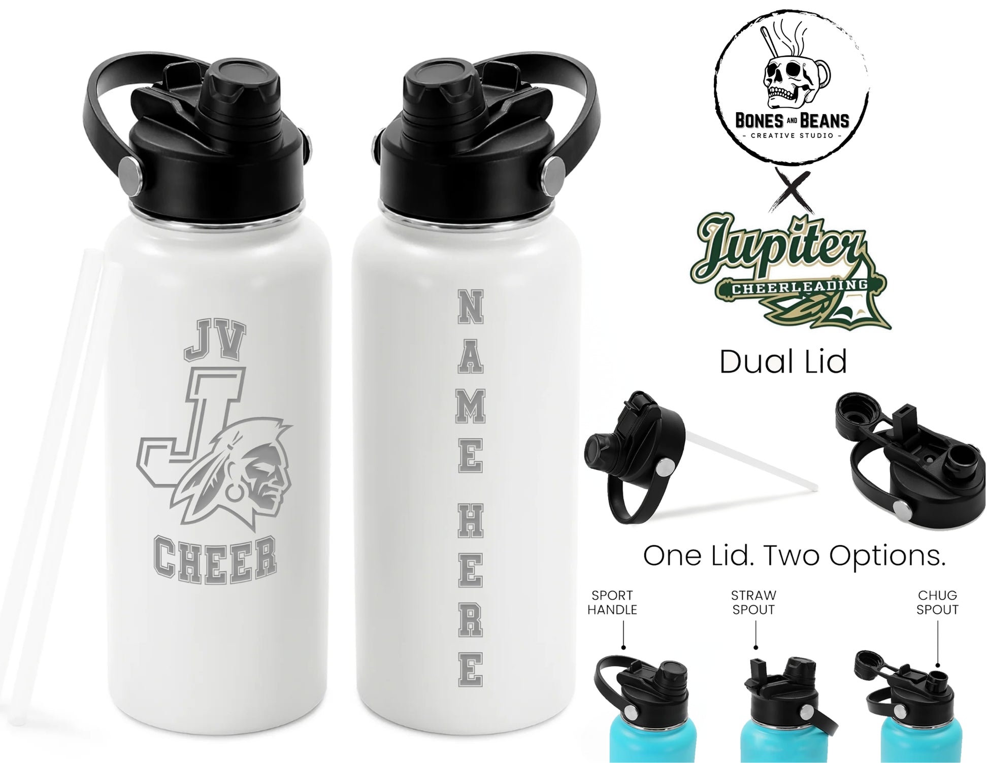 - Sleek 32oz white bottle featuring the Jupiter JV Cheer logo Ā