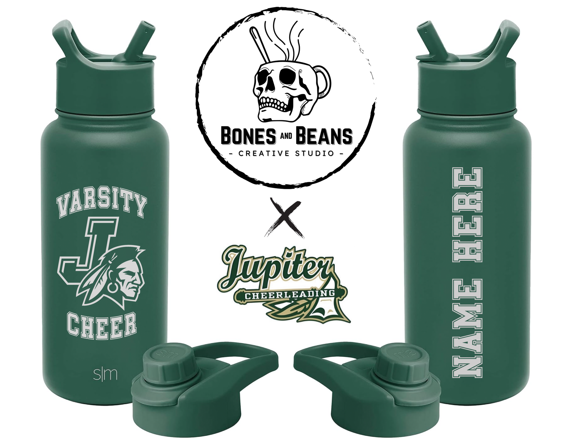 Stay hydrated in style and show your spirit with these **exclusive Jupiter Varsity Cheer water bottles**, custom-designed in collaboration with **Bones & Beans Creative Studio** and **Jupiter Cheerleading**!