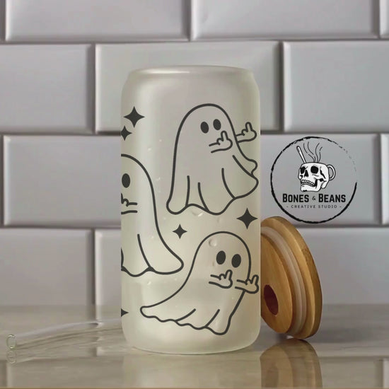 **Introducing "Sassy Ghosts - 16oz Frosted Glass Cup" from Bones and Beans Creative Studio!**