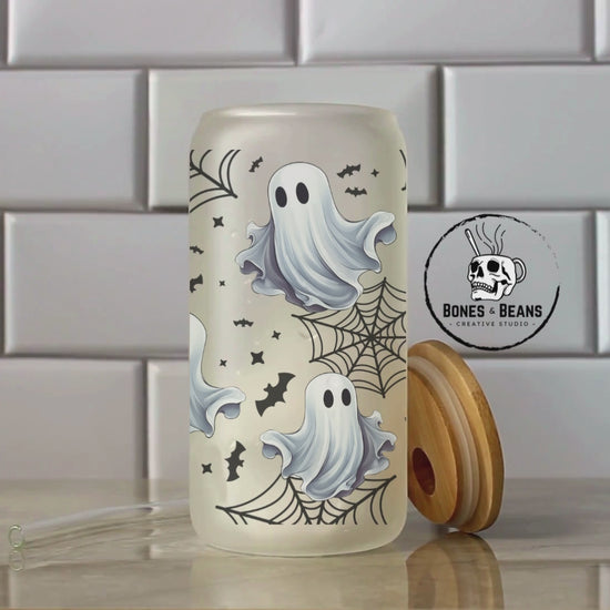 Introducing our Spooky Ghosts Cup, the perfect addition to your Halloween season festivities. This 16oz frosted glass tumbler features a charming and slightly eerie sublimated design of floating ghosts gracefully dancing amongst intricate cobwebs. It's the ideal companion for sipping your favorite seasonal beverages, whether it's pumpkin spice lattes, hot apple cider, or a bewitching brew of your own creation.