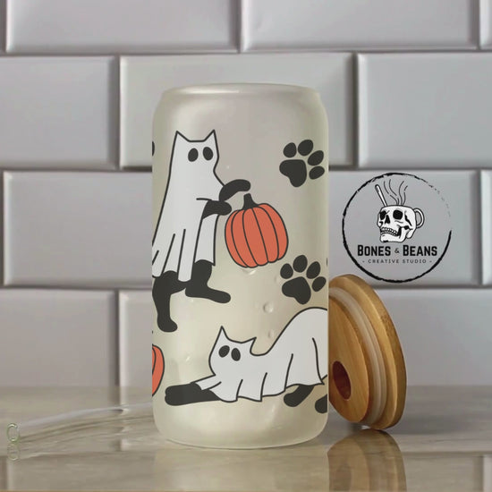 Get ready to purr with delight as you sip from our "Spooky Kitties Cup," where enchantment meets cuteness in a bewitching fusion. Designed to perfection, this 16oz frosted glass cup will transport you to a world where playful kitties embrace the spirit of Halloween.